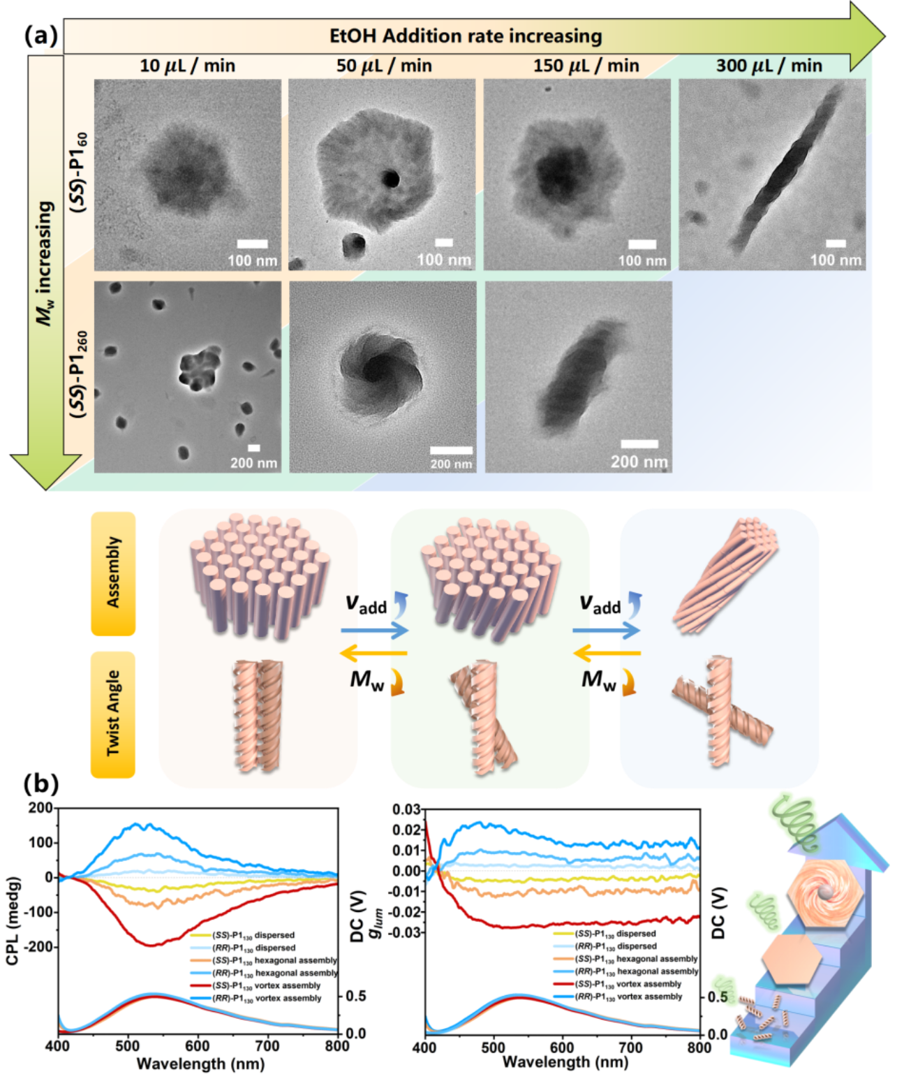 图4. 手性组装的分子量依赖性(上)和CPL增强(下)。