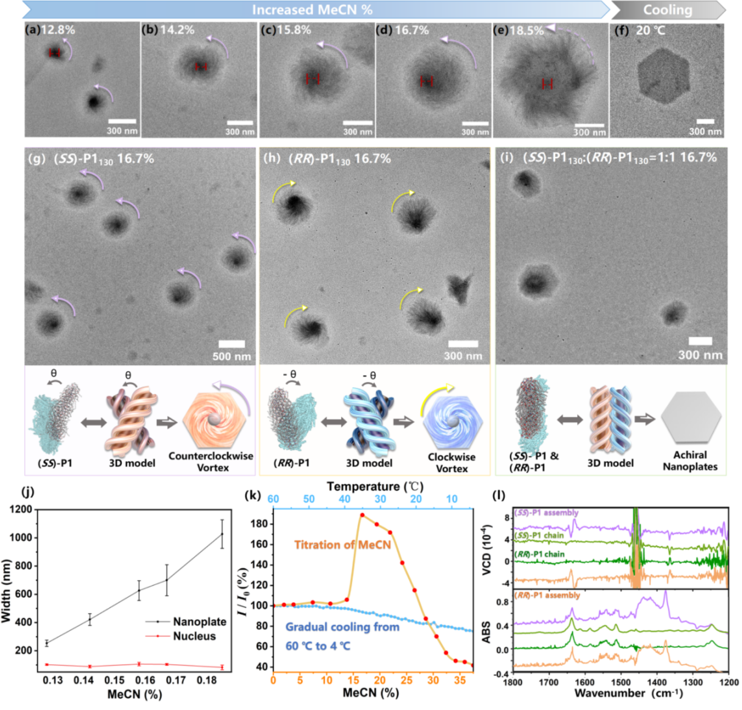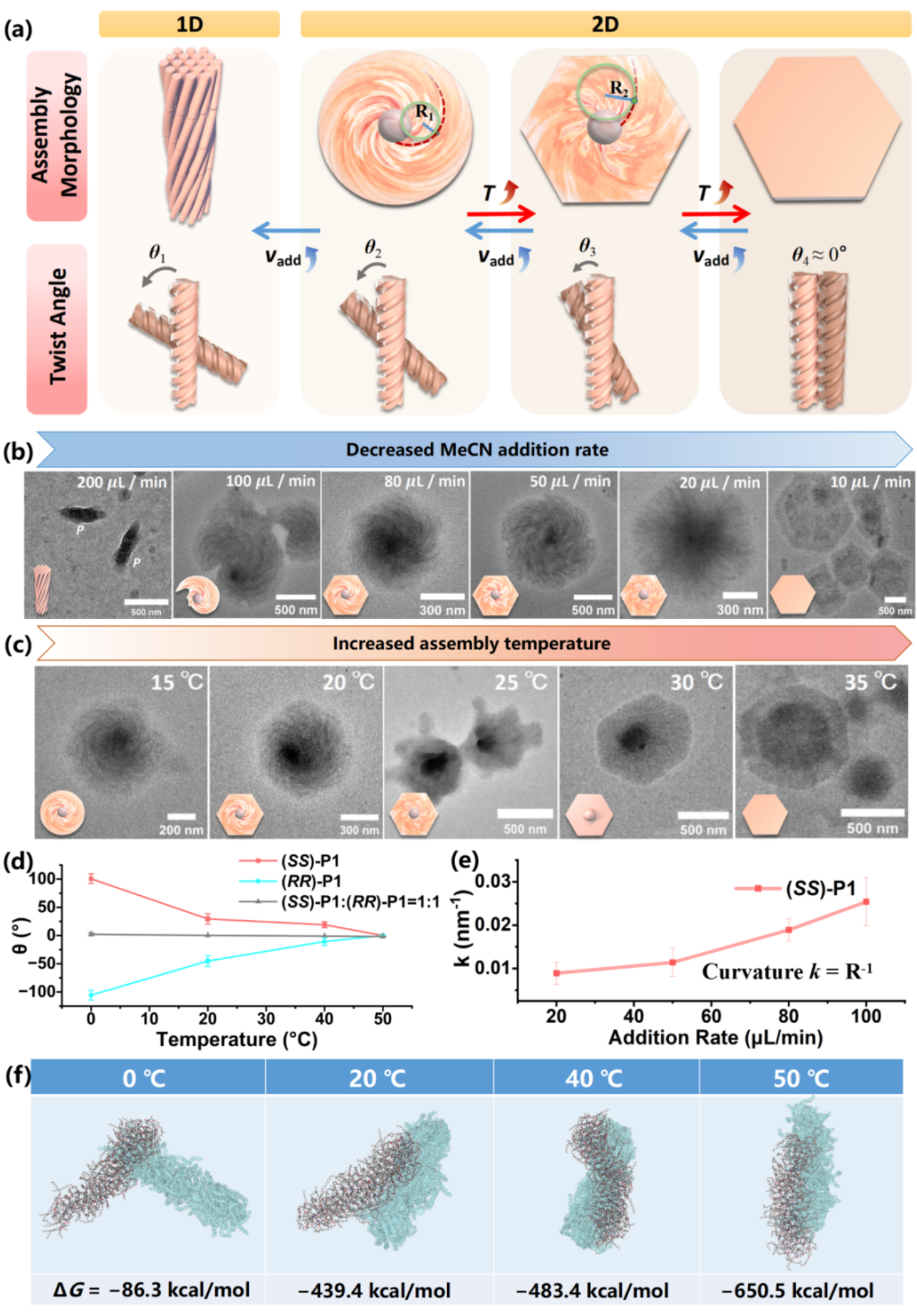 分子手性决定了链间扭曲角的方向,而组装条件可以调控扭曲角度的绝对值大小。通过改变不良溶剂滴加速率、组装环境温度等动力学参数,可有效调节链间扭曲角的大小,进而实现对组装体涡旋方向、曲率与组装维度的可编程调控(图3)随着温度下降,分子动力学模拟表明链间扭曲角逐渐增大,对应的TEM 统计结果显示涡旋曲率增加、六方轮廓逐渐转变成圆形。