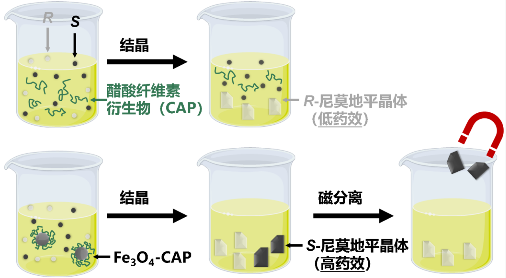根据“反转规则”,在逆向结晶过程中所得晶体的手性与所使用抑制剂的手性相反。对于小分子或合成高分子而言,只需合成具有相反手性的抑制剂,就能获得相反手性的对映体晶体。然而,天然高分子的手性由其生物合成途径决定,这从根本上限制了其通用性,因为几乎无法通过化学合成手段反转其固有手性以期获得另外一种对映异构体晶体。为此,北京大学化学与分子工程学院的宛新华/张洁团队设计了一种磁性纳米拆分剂,并将其用于脑血管药物尼莫地平的结晶拆分中。尼莫地平S-对映体的活性是R-对映体的5倍。通过将醋酸纤维素衍生物接枝到Fe₃O₄纳米粒子表面,其高分子壳层能够选择性富集原本被抑制的S-尼莫地平分子团簇,使其以磁性晶体的形式结晶,最终获得可观数量的无磁性R-晶体和有磁性S-晶体,再通过外加磁场将二者高效分离。而仅使用醋酸纤维素衍生物只能在结晶中得到活性低的R-晶体。进一步研究表明,聚合物的链长和Fe3O4纳米粒子的大小显著影响拆分效果。分子量大于20 kDa,且Fe3O4颗粒的尺寸在5-14 nm之间,拆分效果最优,S-和R-对映体的光学纯度分别为82ee%和92ee%,总产率为40%。此项研究突破了天然高分子在手性分离中的固有局限,研究中构建的磁性纳米拆分剂平台可拓展至更广泛的手性分子体系,同时为其与连续化工艺的集成及工业应用提供了可能。
