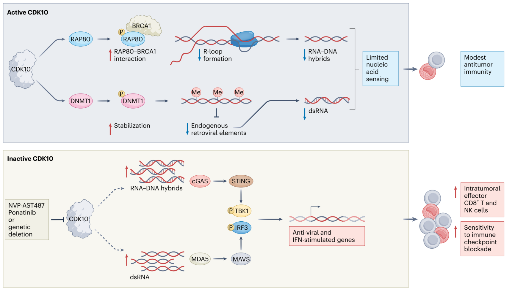 在该研究中,合作团队通过体内激酶组 CRISPR/Cas9 筛选,系统性鉴定出 CDK10 是肿瘤免疫监视的关键负调控因子。功能实验证明其激酶活性是促进免疫逃逸所必需的。多组学分析表明,敲除 CDK10 可重塑肿瘤微环境、增强免疫活化,并依赖 CD8⁺ T 和 NK 细胞抑制肿瘤生长。机制研究发现,CDK10 可磷酸化表观调控因子 DNMT1 和 DNA 损伤修饰因子 RAP80 ,分别抑制细胞中 dsRNA 与 R-loop 积累,从而阻断 MDA5 和 cGAS 介导的天然免疫激活,促进免疫逃逸。