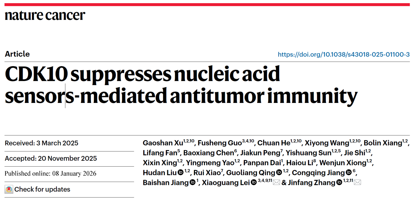 2026年1月8日,北京大学化学与分子工程学院、北大-清华生命科学联合中心雷晓光教授团队与合作者武汉大学医学研究院张金方教授团队在国际顶级肿瘤学期刊《Nature Cancer》杂志上发表了题为“CDK10 suppresses nucleic acid sensors-mediated antitumor immunity”的研究论文。该研究首次揭示了细胞周期蛋白依赖性激酶10(CDK10)在介导肿瘤免疫逃逸中的关键作用,并开发了CDK10的高选择性小分子抑制剂,为克服现有免疫治疗瓶颈提供了新靶点与新策略。