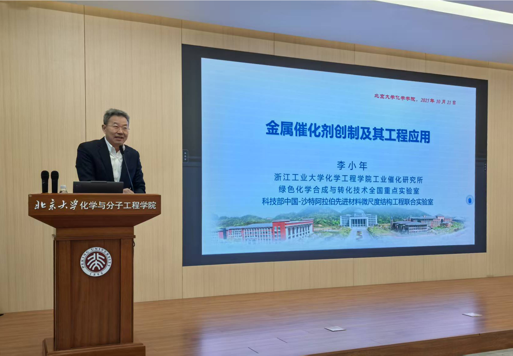 On Oct. 21st, Prof. Li Xiaonian from Zhejiang University of Technology visited Peking University for an academic report at the invitation of Prof. Zhang. He toured our lab and exhibition boards under Prof. Zhang's guidance and took a group photo with us. At afternoon, he delivered a special lecture on the manufacturing and industrial applications of metal catalysts in CB101, where he discussed the application of metal catalysts from an industrial perspective. We would like to thank Prof. Li Xiaonian for his visit!