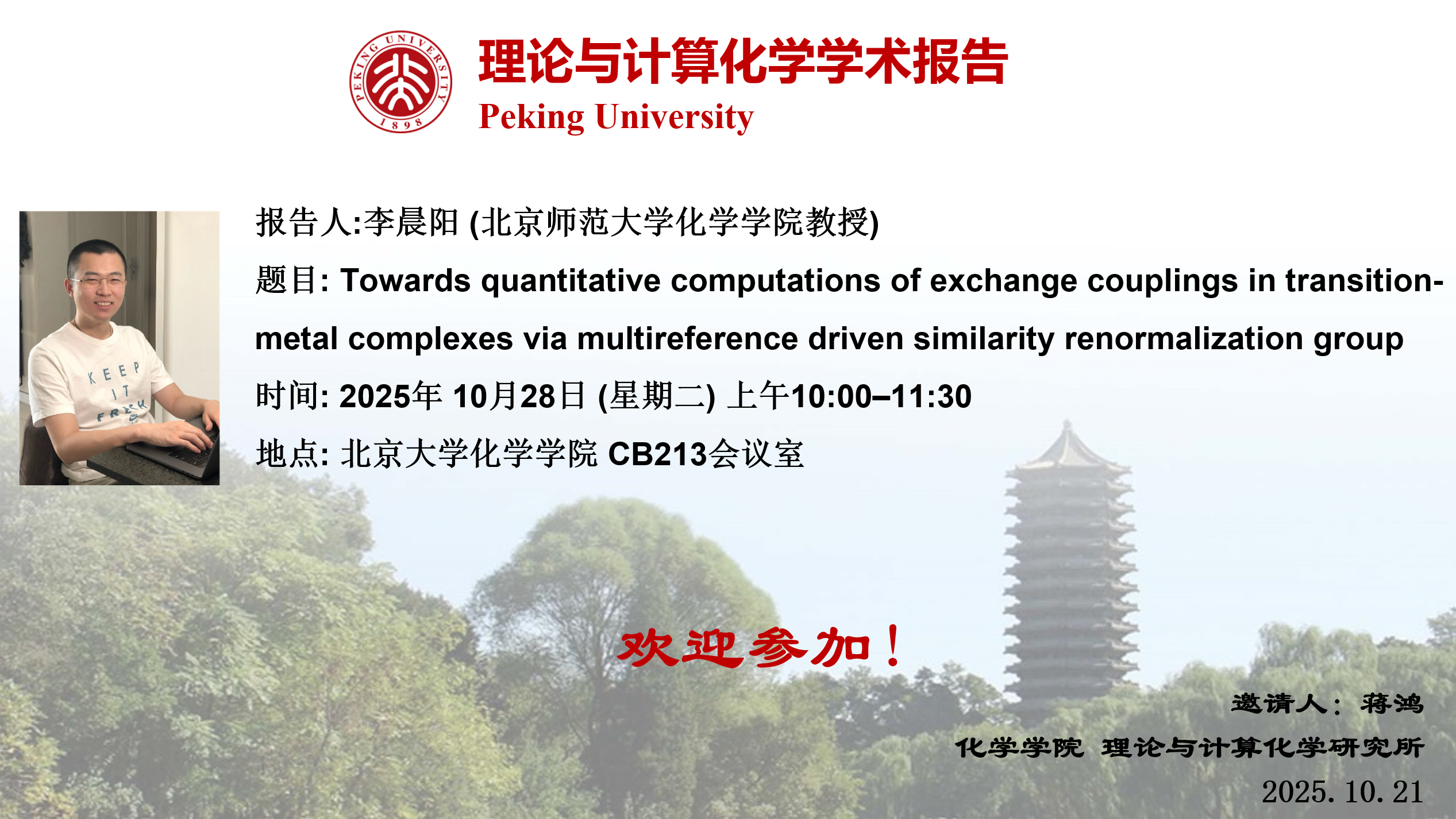 李晨阳,北京师范大学化学学院教授,博士生导师。2012年本科毕业于南京大学化学与化工学院,2015年在美国佐治亚大学获理学博士学位。此后在美国埃默里大学进行博士后研究,2021年加入北京师范大学化学学院。研究方向为电子结构理论方法的开发与应用,特别是发展精确高效的激发态电子结构方法及其解析梯度理论。曾获国家自然科学基金委优秀青年科学基金(海外)资助。