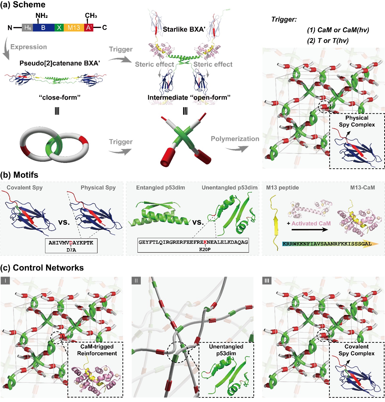 北京大学化学与分子工程学院张文彬课题组在Angew. Chem. Int. Ed.期刊发表了题为“A High Modulus, Multi-Stimuli Responsive, Interwoven Protein Network with Topologically Confined Micro-Association”的封面论文(https://onlinelibrary.wiley.com/doi/10.1002/anie.202522633),报道了一种基于伪[2]轮烷构建单元BXA′的全蛋白质编织网络(图1)。该单元由三部分组成:p53dim结构域用于拓扑缠结,SpyTag(DA)-SpyCatcher提供动态相互作用,CaM-M13模块用于外部调控。在浓度提升、钙调蛋白结合或紫外光照(光敏型CaM(hv))条件下,BXA′可由闭合态转变为星形开放态,进而聚合成物理交联的编织网络。