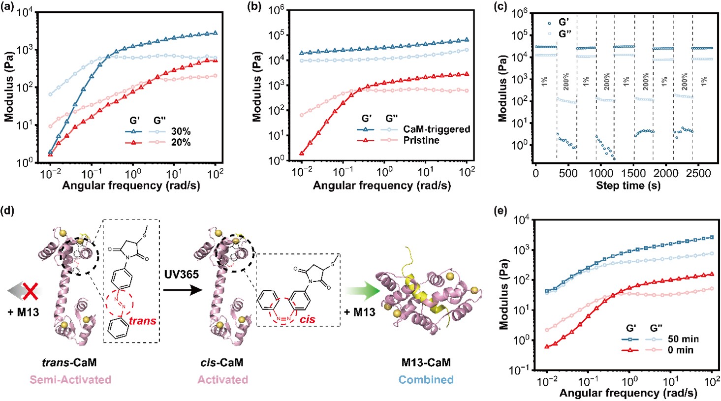 在CaM触发条件下,BXA′网络的储能模量G'随浓度上升,30% w/v样品的储能模量超过60 kPa;进一步通过热处理(≈70 °C)或近红外光热激活诱导“拓扑限域微相分离”,G'可进一步提升至~100 kPa,AFM纳米压痕测得的杨氏模量接近1 MPa,处于全蛋白质物理水凝胶的领先水平。该材料同时具备自愈合性与多重刺激响应能力,实现了高强度与动态功能的统一。