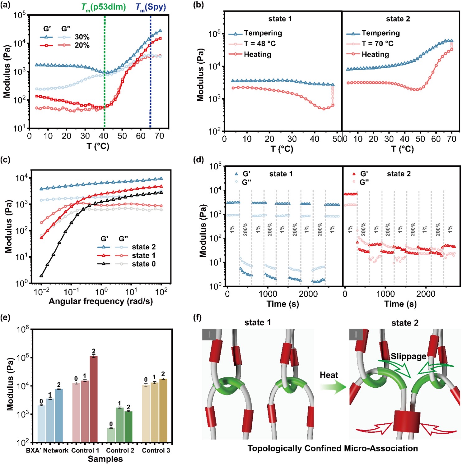 机理研究表明(图3),编织网络的拓扑约束有效限制了SpyTag(DA)-SpyCatcher复合体在高温下的展开与聚集尺度,防止宏观相分离,从而在增强模量的同时保持材料完整性。相较于未缠结或全共价交联的对照体系,该策略在力学性能、抗溶蚀性和热稳定性方面均表现出显著优势。