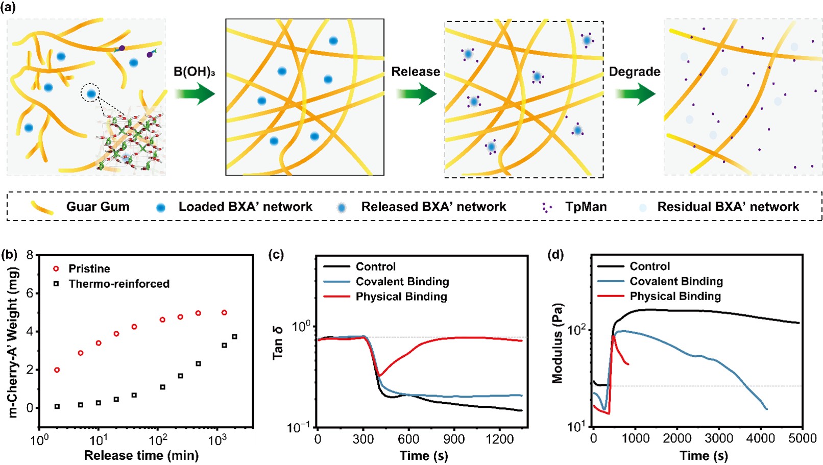 此外,研究团队将该增强网络用于热稳定内切甘露聚糖酶 TpMan 的负载与可控释放(图4)。通过调控酶与网络的共价或非共价结合模式,实现了不同的释放动力学与瓜尔胶降解行为,展示了其在需时序控制释放的工业流程(如油气开采中的延迟破胶)中的潜力。